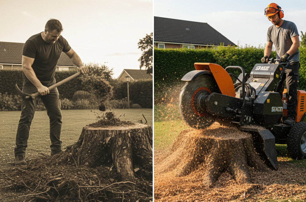 Manual stump removal requires digging, chopping, and sometimes chemical treatments, which can be exhausting and potentially unsafe.